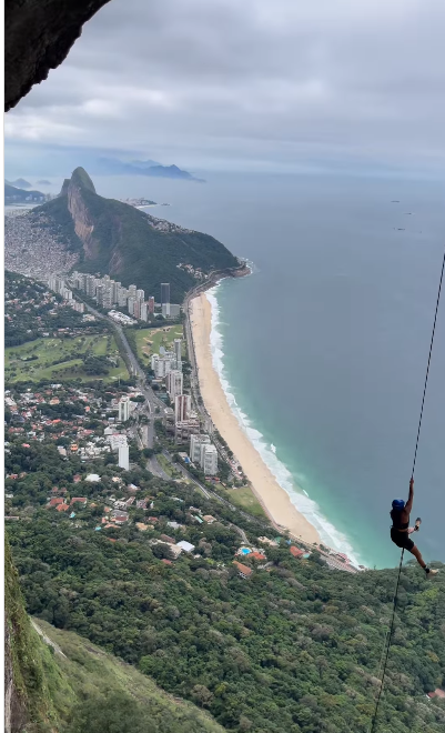 PONTO 2 – A cadeirinha utilizada não é a ideal para a atividade, ela não foi projetada para esta finalidade por não ter a parte peitoral que mantém o participante estável com a carga de peso melhor distribuída pelo corpo, notamos que o tronco do cliente é sustentado apenas pelos braços dos clientes, caso o cliente não aguente segurar ele é projetado e fica de cabeça para baixo ai gera risco de síndrome de suspensão inerte no cliente e ela pode voltar contra a rocha e bater na mesma.